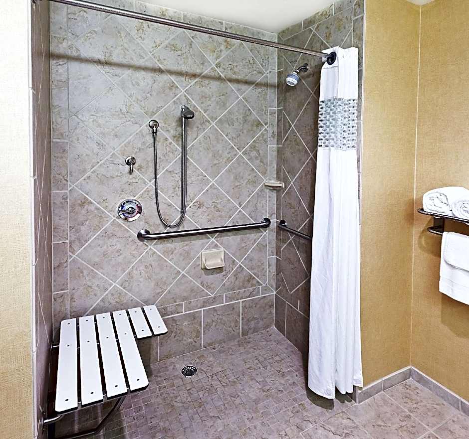 Any corresponding photo may not reflect the specific accessible room type or room feature. This mobility and hearing accessible, nonsmoking room features one king sized bed featuring our luxurious Clean and Fresh Hampton Bed. The bath is equipped with accessible roll-in shower. The room also has a visual alarm and notification devices for the doorbell or door knock and incoming phone calls. The room features comfortable soft seating, microwave, refrigerator, HDTV, and easy to operate alarm clock/radio. The free high speed internet access will help you stay connected while on the road. If you prefer not to work at the desk, you can use the convenient lap desk instead. You'll also enjoy the convenience of having a coffee maker with tea service and iron/ironing board in your room.